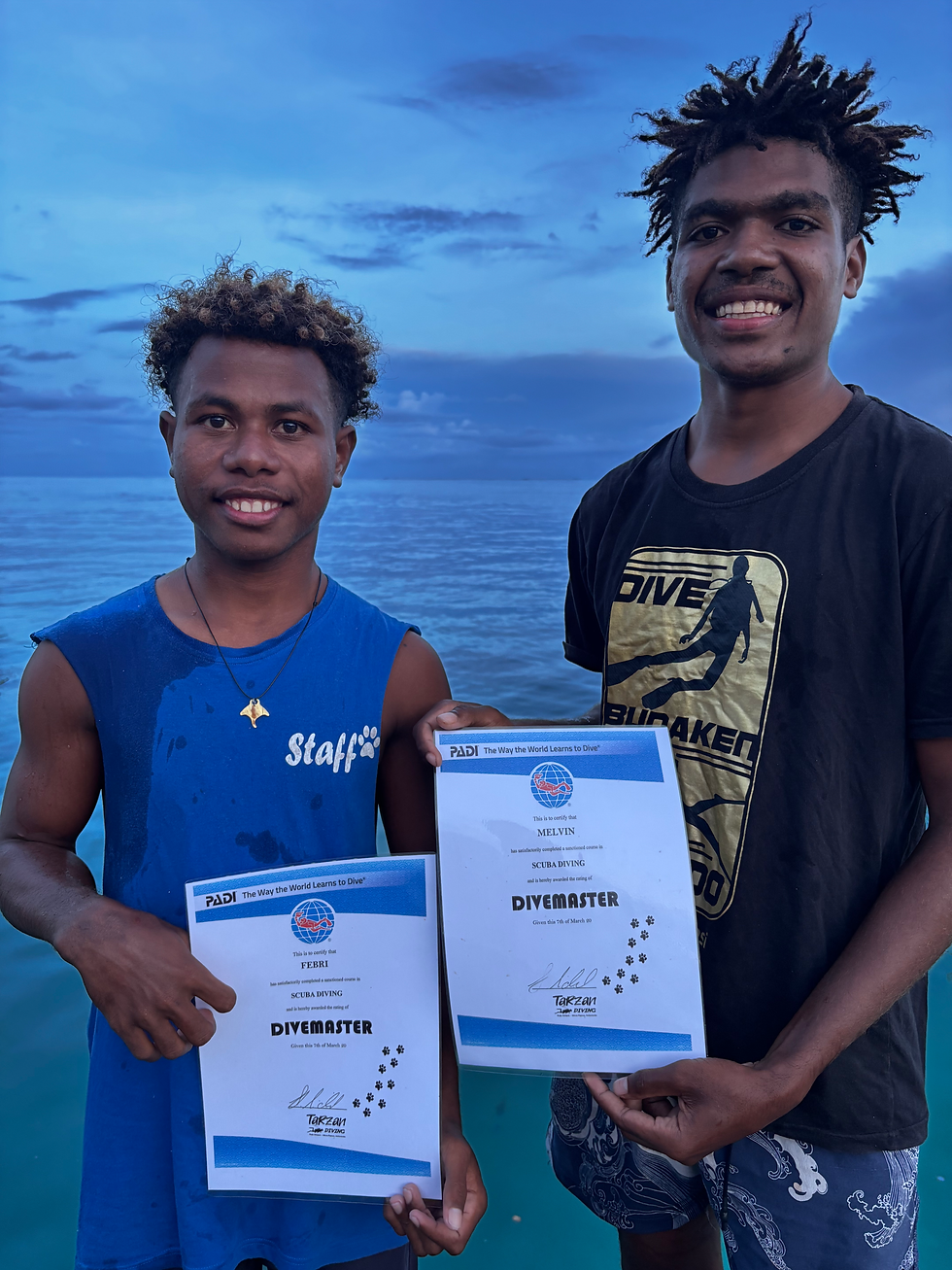 As part of their practical training—an essential component of our educational approach—the two successfully completed the Divemaster course after more than eight months of intensive training with Tarzan Diving.